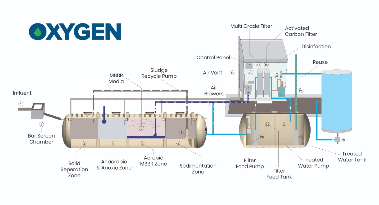 Inlet → Bar Screen Chamber→ Removes grit, large solids, and floating materials from raw sewage, →Solid separation /Primary settling zone → Separate solids from liquid waste water →Anoxic Zone/Primary Settling, supports denitrification process — converts nitrates to nitrogen gas, reducing nitrogen content in effluent → Aeration Zone (MBBR Reactor) (Air diffusers/blowers supply oxygen to aerobic bacteria that further degrade remaining organic matter. Bacteria attached to media break down organic pollutants for BOD/COD reduction → Sedimentation/ Clarifier Zone, Separates suspended solids and clarifies treated water → Filter/Disinfection (TTP), Final polishing using sand/carbon filter and chlorination/UV disinfection.) → Treated Water Outlet